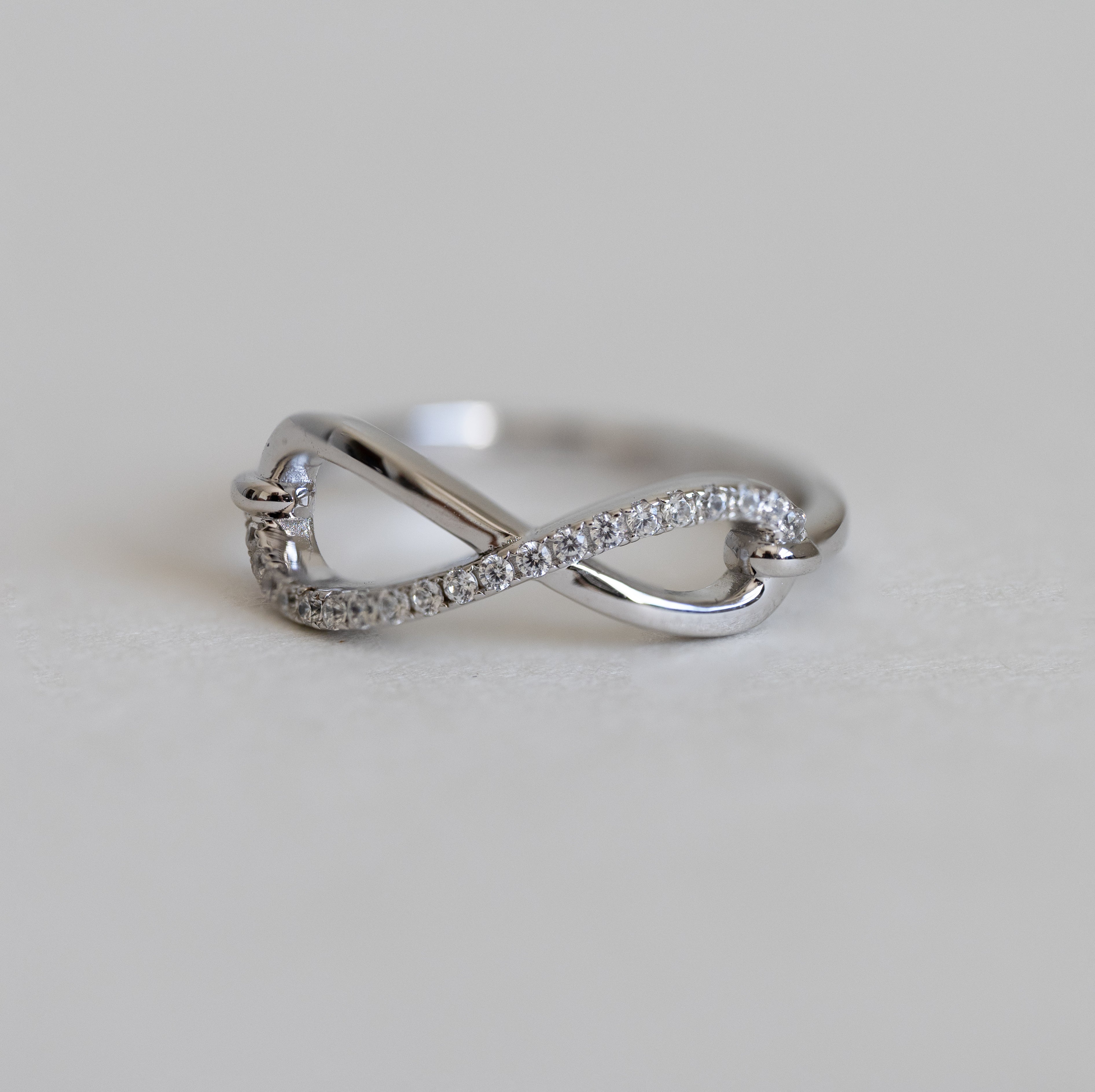 Crafted in 925 sterling silver with rhodium plating, this infinity ring combines timeless elegance with enduring symbolism. Delicate pave cubic zirconias catch the light beautifully, adding sparkle and dimension to the design. The infinity symbol represents boundless love, eternal connection, and limitless possibilities—making this piece a meaningful choice for personal milestones or cherished relationships. The rhodium finish ensures a brilliant, long-lasting shine while protecting against tarnish. Whether worn as a daily reminder of what matters most or gifted to someone special, this sophisticated ring transcends trends with its classic appeal and profound significance.