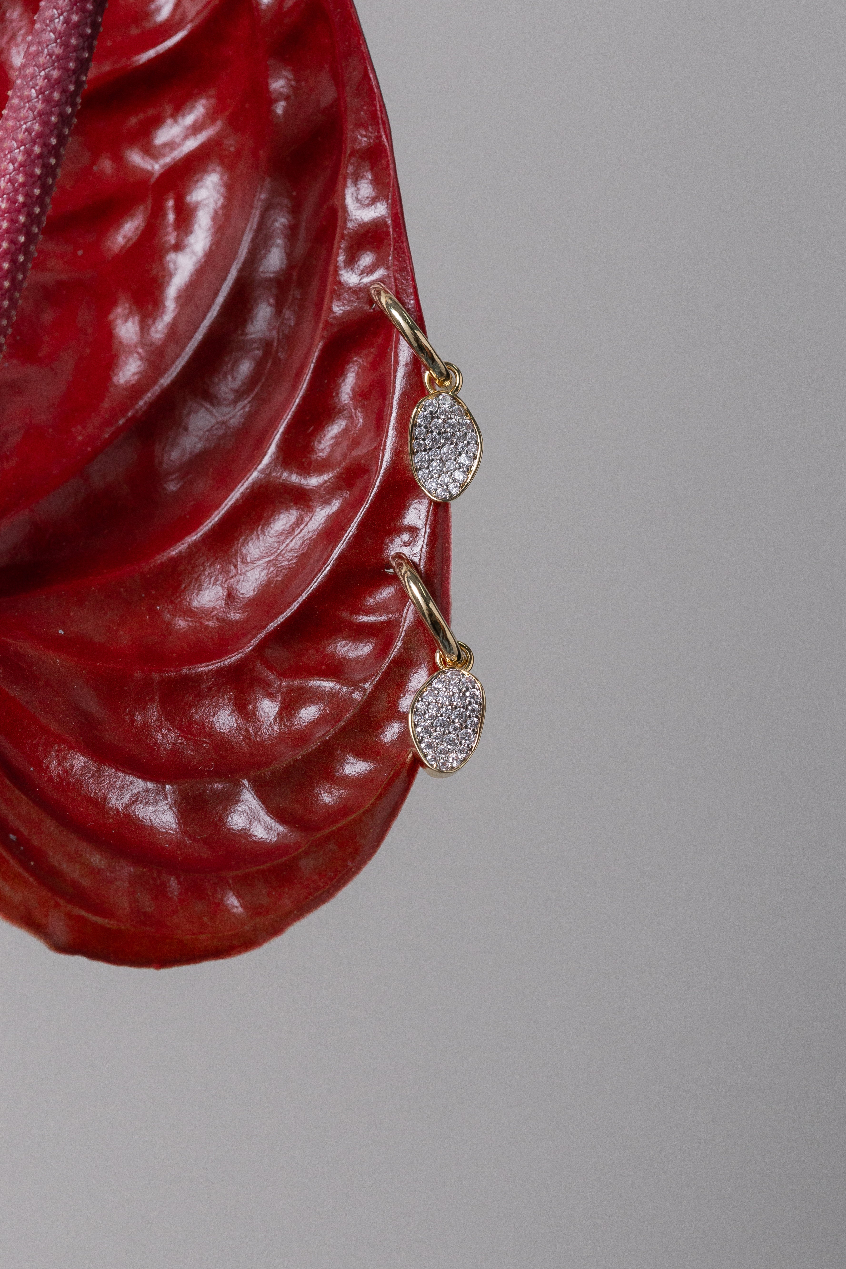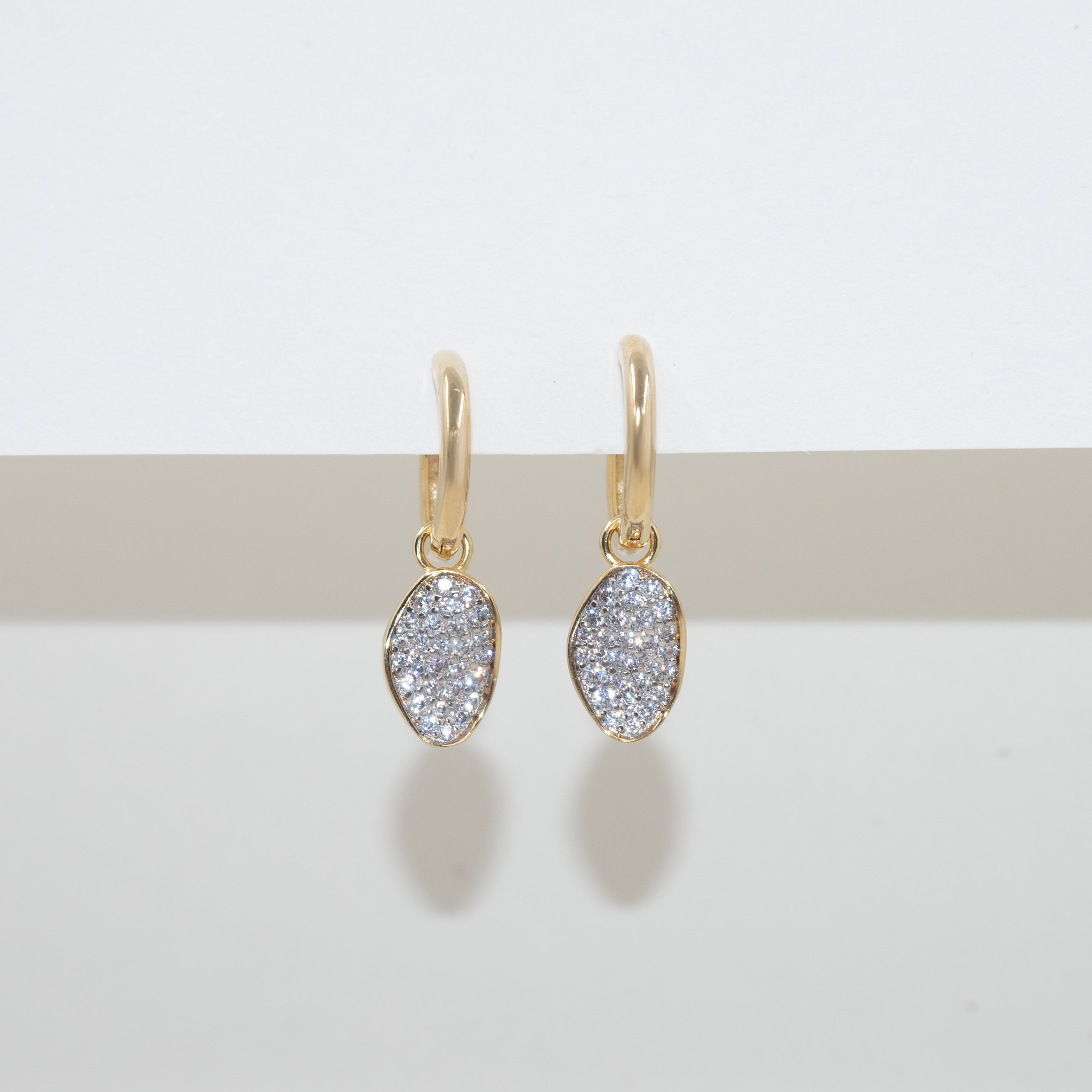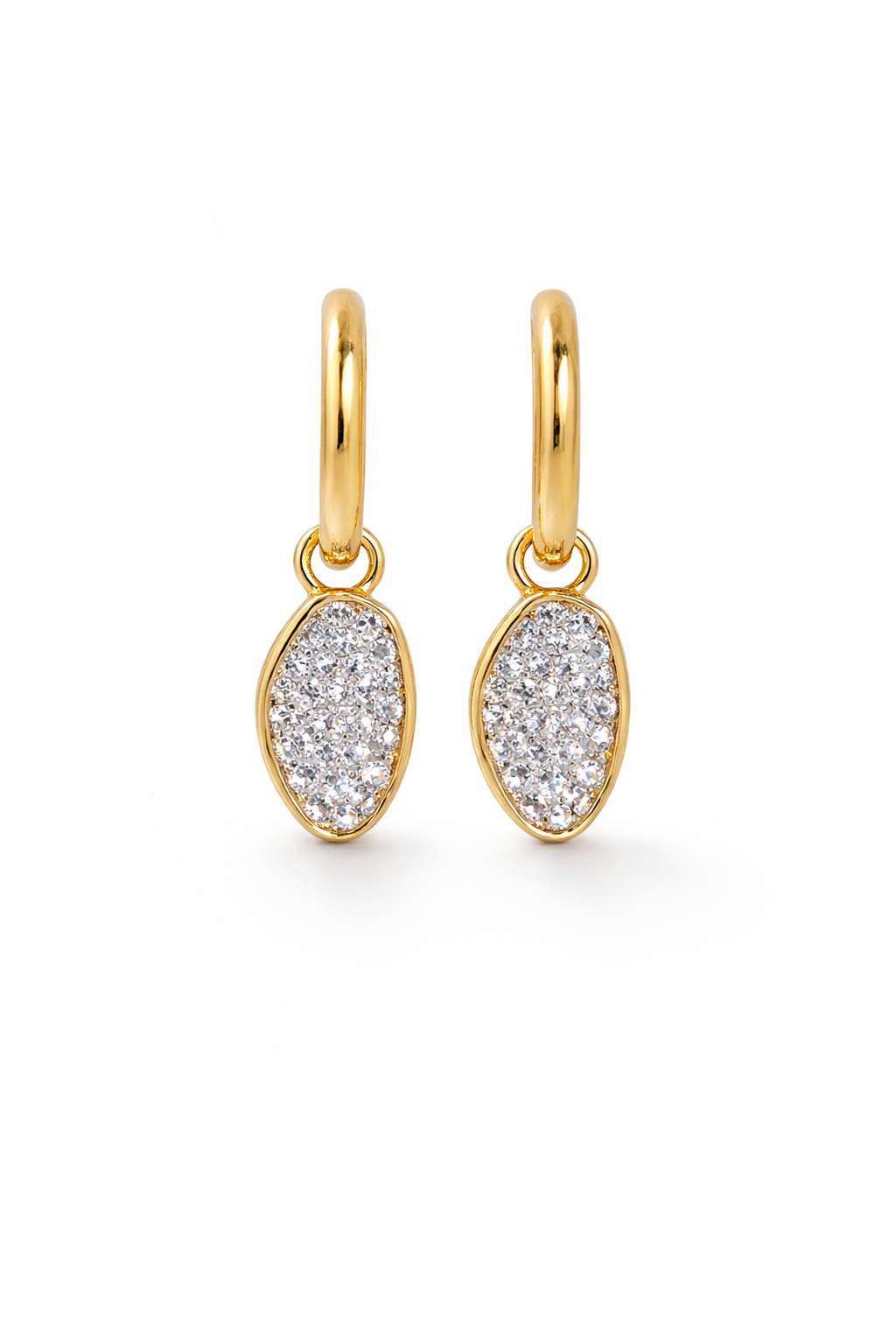 Delicate huggie hoops finished with an oval pavé charm that catches the light with subtle brilliance. Minimal, refined, and effortless—perfect for everyday wear or layered ear stacks. Lightweight and comfortable, designed to elevate even the simplest look.