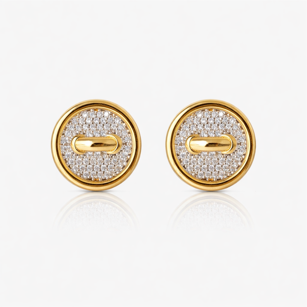 Delicate yet structured, these earrings draw from the classic form of a button — a quiet emblem of strength. A round pavé face and golden edge create harmony and polish, perfect for adding refined presence to your daily wear.