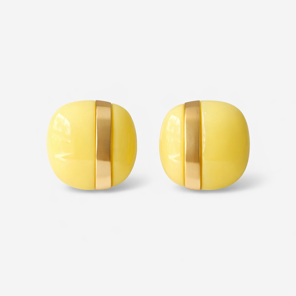 The Revive Studs are crafted in buttery yellow resin, wrapped with a sleek golden stripe — a quiet nod to 70s statement style. Light, sculptural, and undeniably cool, they bring a playful twist to timeless dressing. Wear them with tailoring or sun kissed skin — they do both.