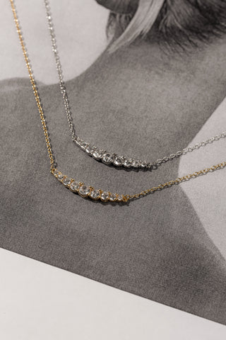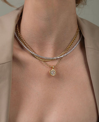 The signature piece of the collection, this necklace features a bold circular pendant that embodies timeless minimalism. Set on a gold-toned chain, it’s ideal for layering or worn solo with quiet impact.