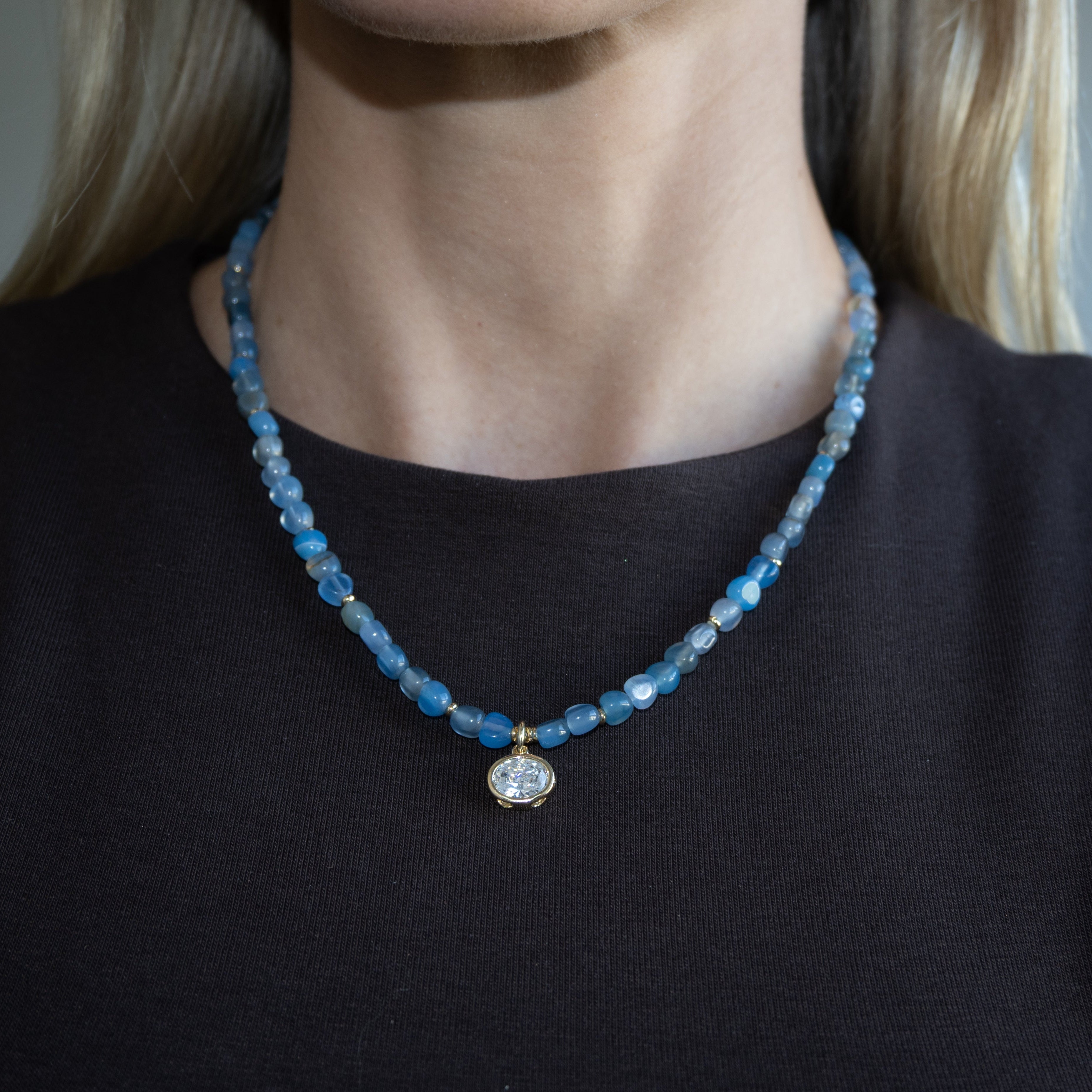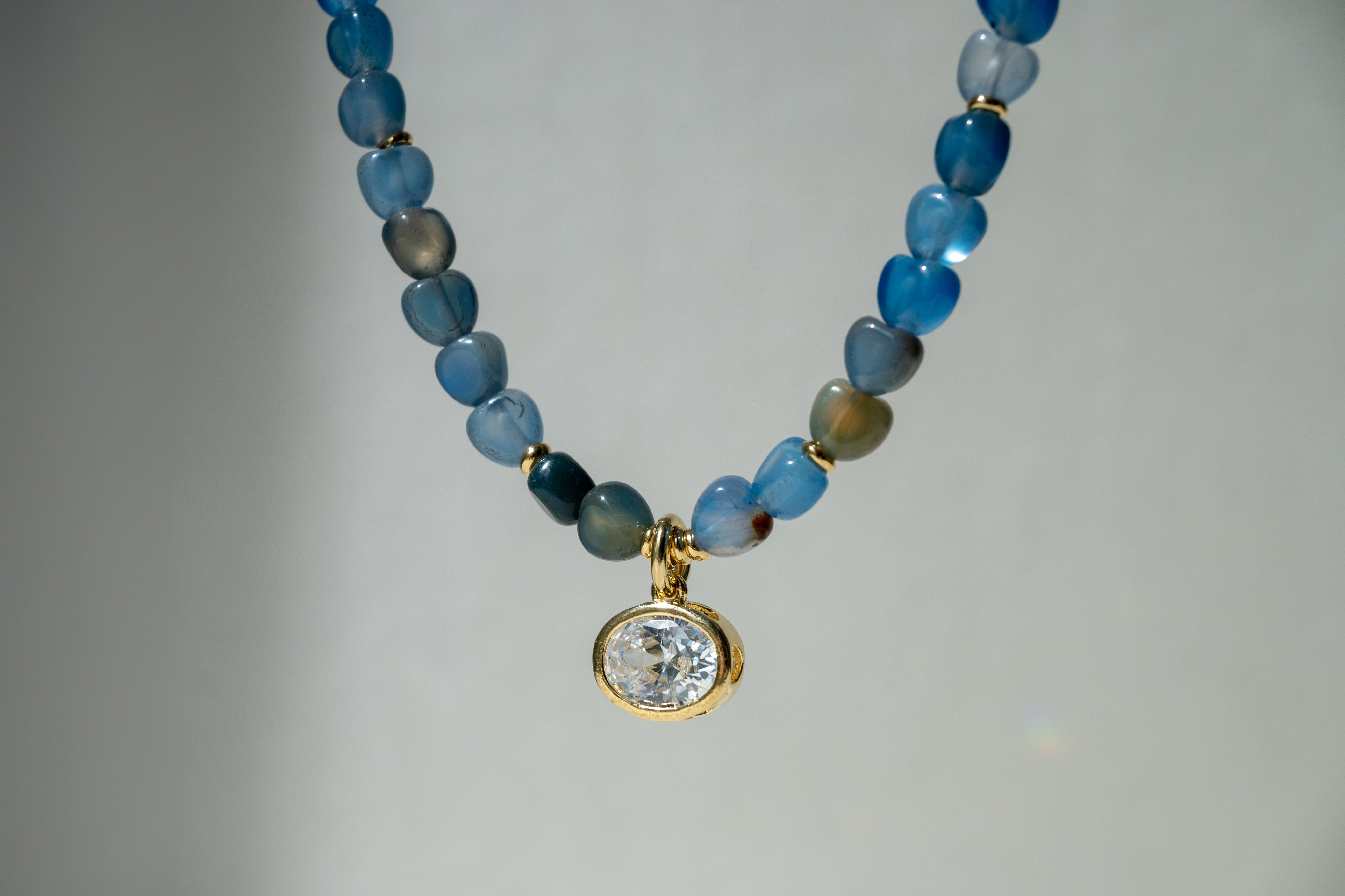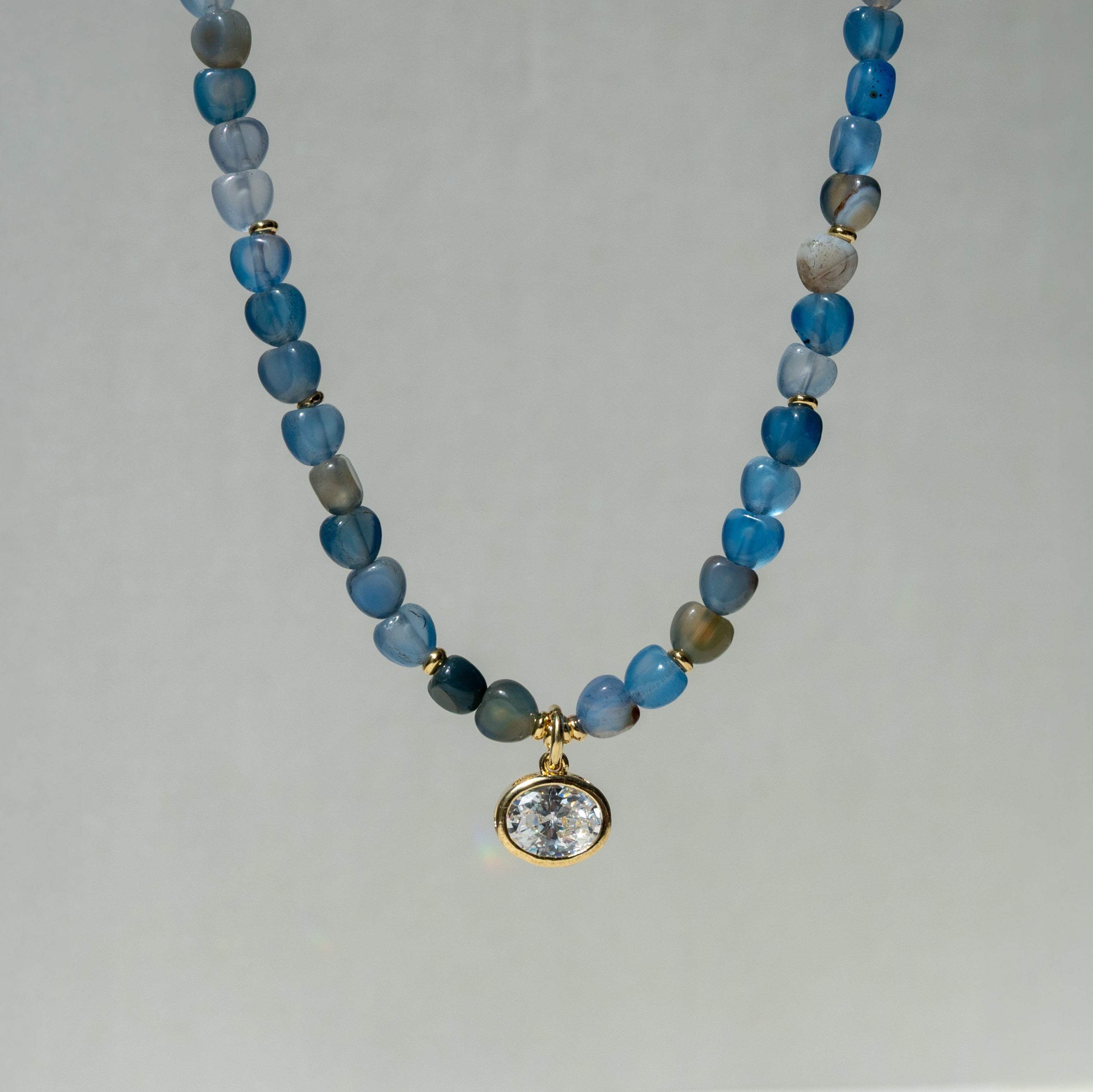 The Oceane Necklace captures the serene beauty of the sea with natural blue agate stones, each with its own unique shade and texture. Finished with delicate golden spacers and a centerpiece crafted from 18k gold-plated brass, it features a brilliant oval-cut cubic zirconia pendant. A refined piece designed for timeless elegance and effortless sophistication.