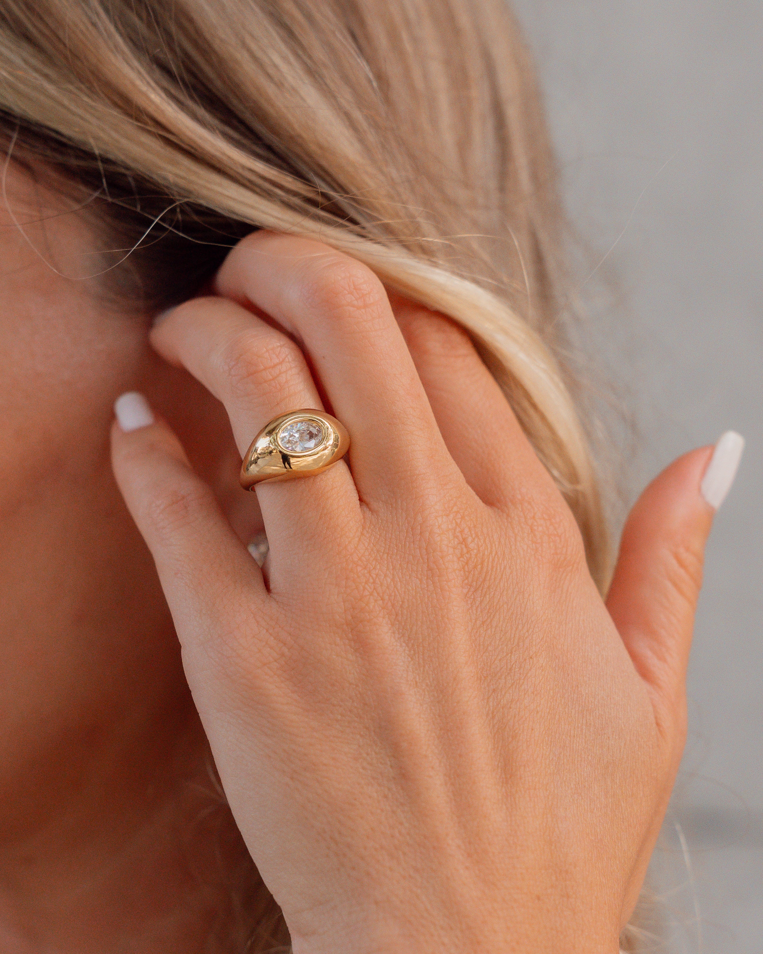 The warm-toned sister to CERCLE II, CERCLE III merges soft volume with radiant gold plating. Its oval contour and luminous central stone bring effortless sophistication — a statement piece that still whispers.