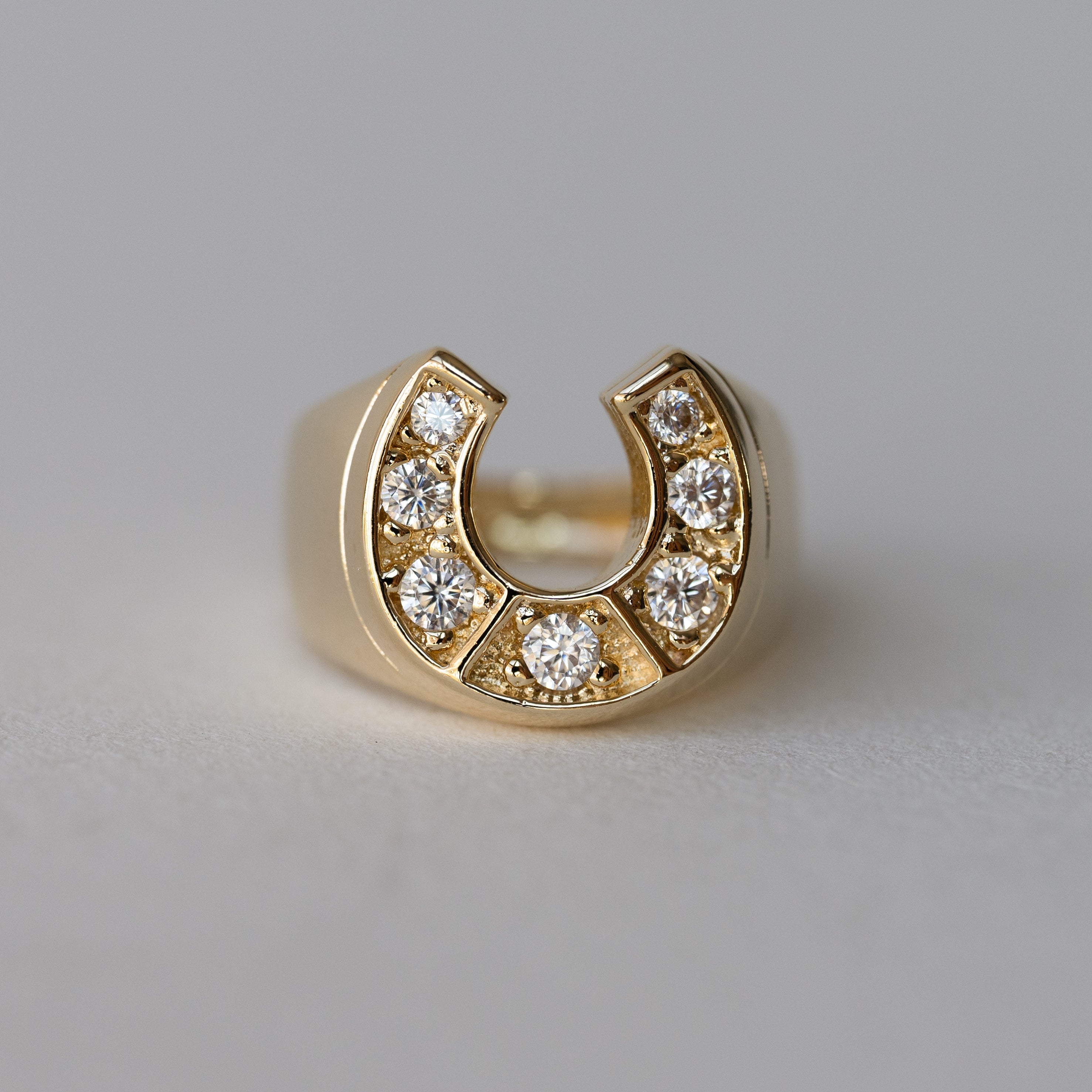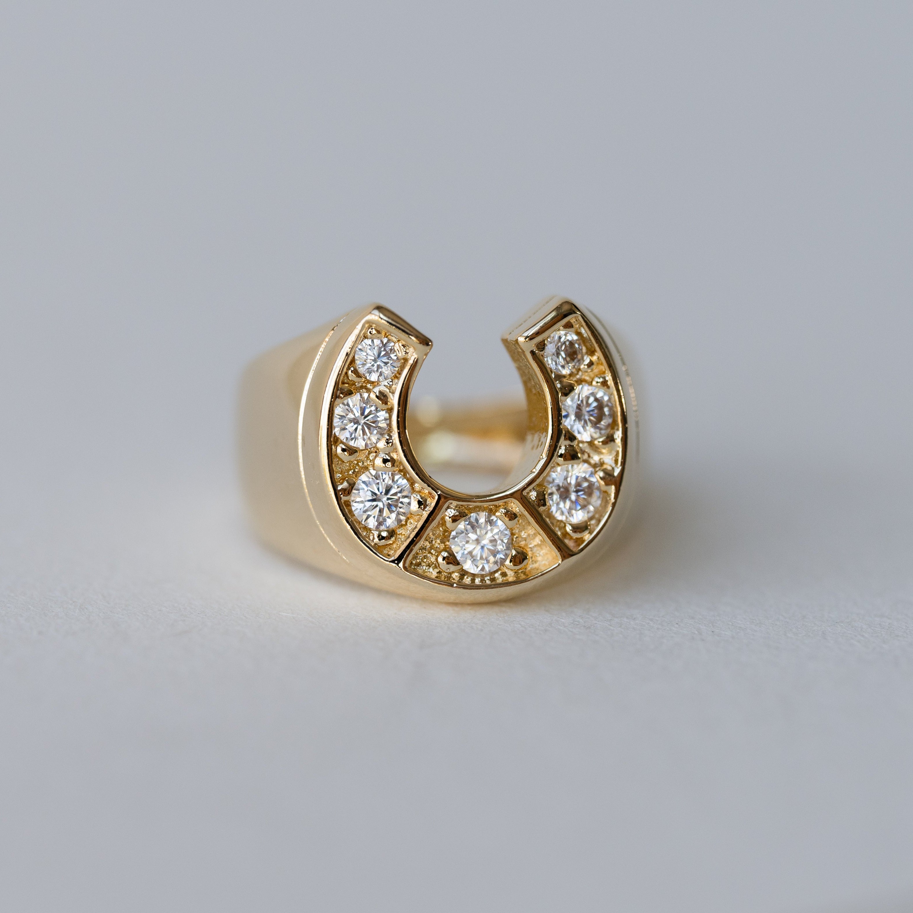 Embrace timeless symbolism with a modern edge. This striking ring features an elegant horseshoe design embellished with sparkling cubic zirconia stones that catch the light beautifully. Crafted from 18k gold-plated brass, it combines enduring charm with contemporary style—a piece that whispers of good fortune while making a refined statement.