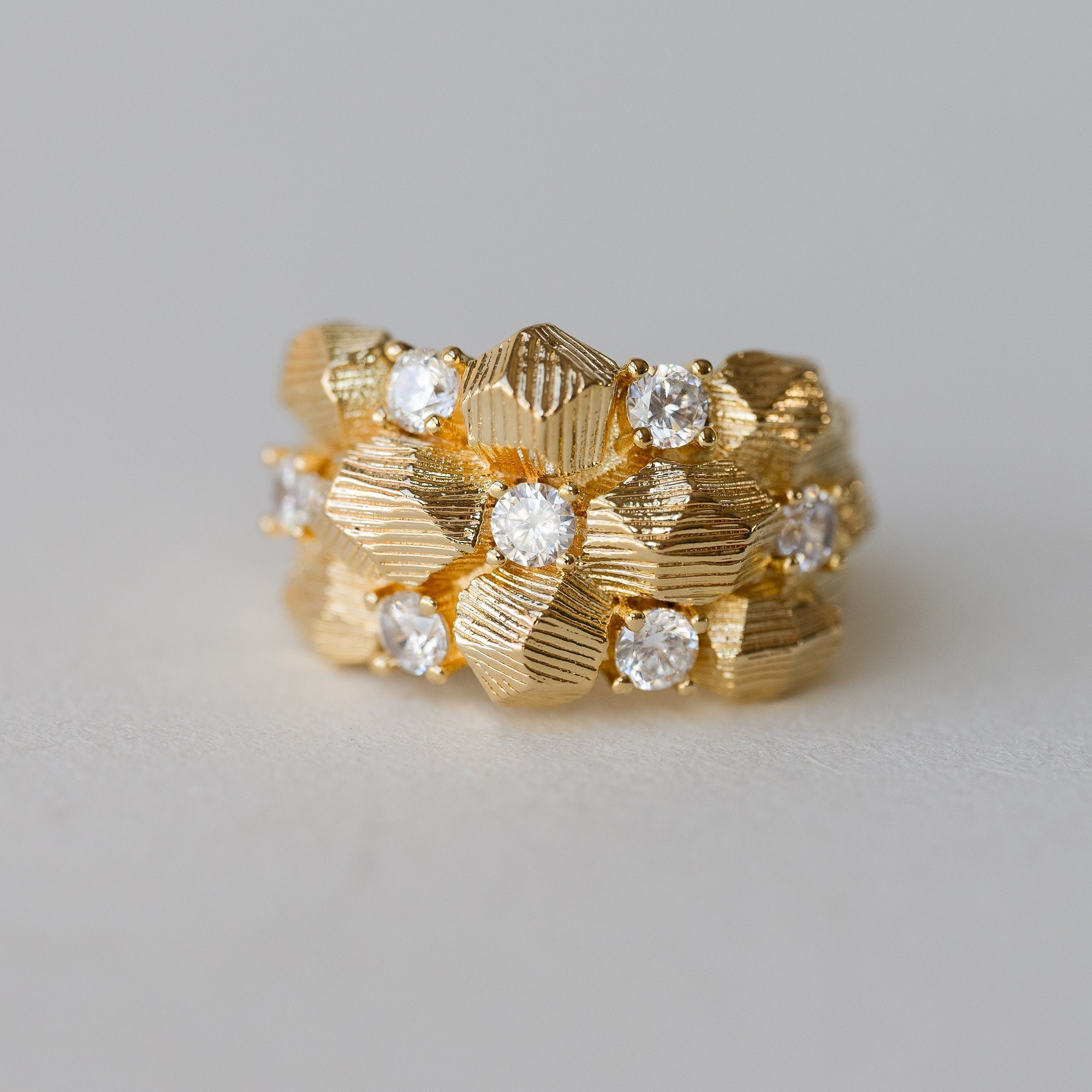 This striking ring showcases dimensional artistry through its intricately textured gold surface, where carefully arranged clusters catch light with brilliant cubic zirconia accents. Crafted from 18K gold-plated brass, it delivers a bold, editorial aesthetic with refined sophistication. A statement piece that commands attention while maintaining elegant craftsmanship.