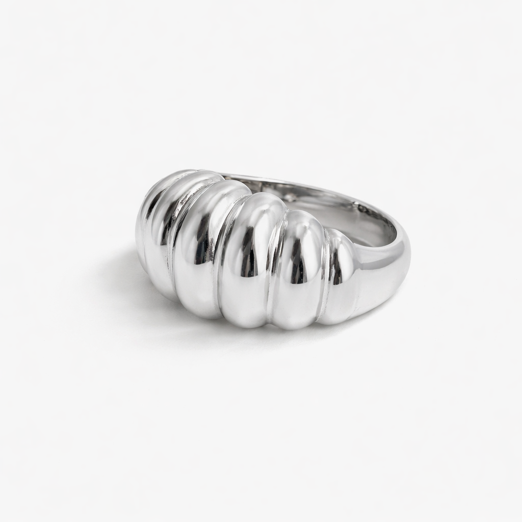 The Silver Cloud Pinky Ring captures contemporary elegance through its voluminous polished dome, crafted from rhodium-plated brass to mimic the luminous quality of liquid metal. Its soft, sculptural curves create a striking visual presence while maintaining a refined, understated aesthetic. The smooth, reflective surface catches light beautifully, making it an ideal statement piece for those who appreciate modern design with effortless sophistication. Perfect for layering or wearing solo.