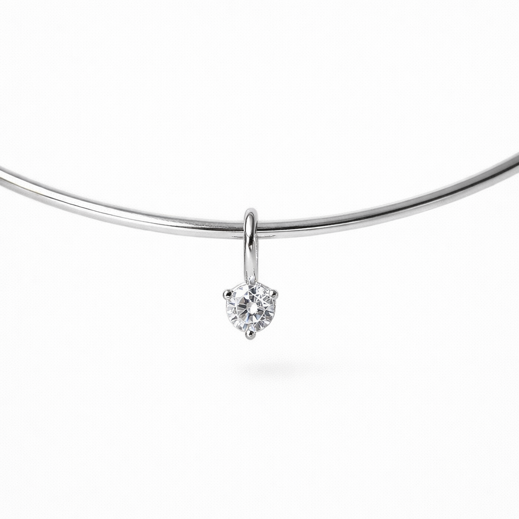 A sculptural collar that frames the neckline with a quiet glow. Crafted in Rhodium-plated brass with a high-polish finish, the minimal arc is punctuated by a single round cubic zirconia—catching light with every move. Lightweight, hypoallergenic, and made for day-to-night comfort, it delivers presence without noise—refined, modern, and enduring.