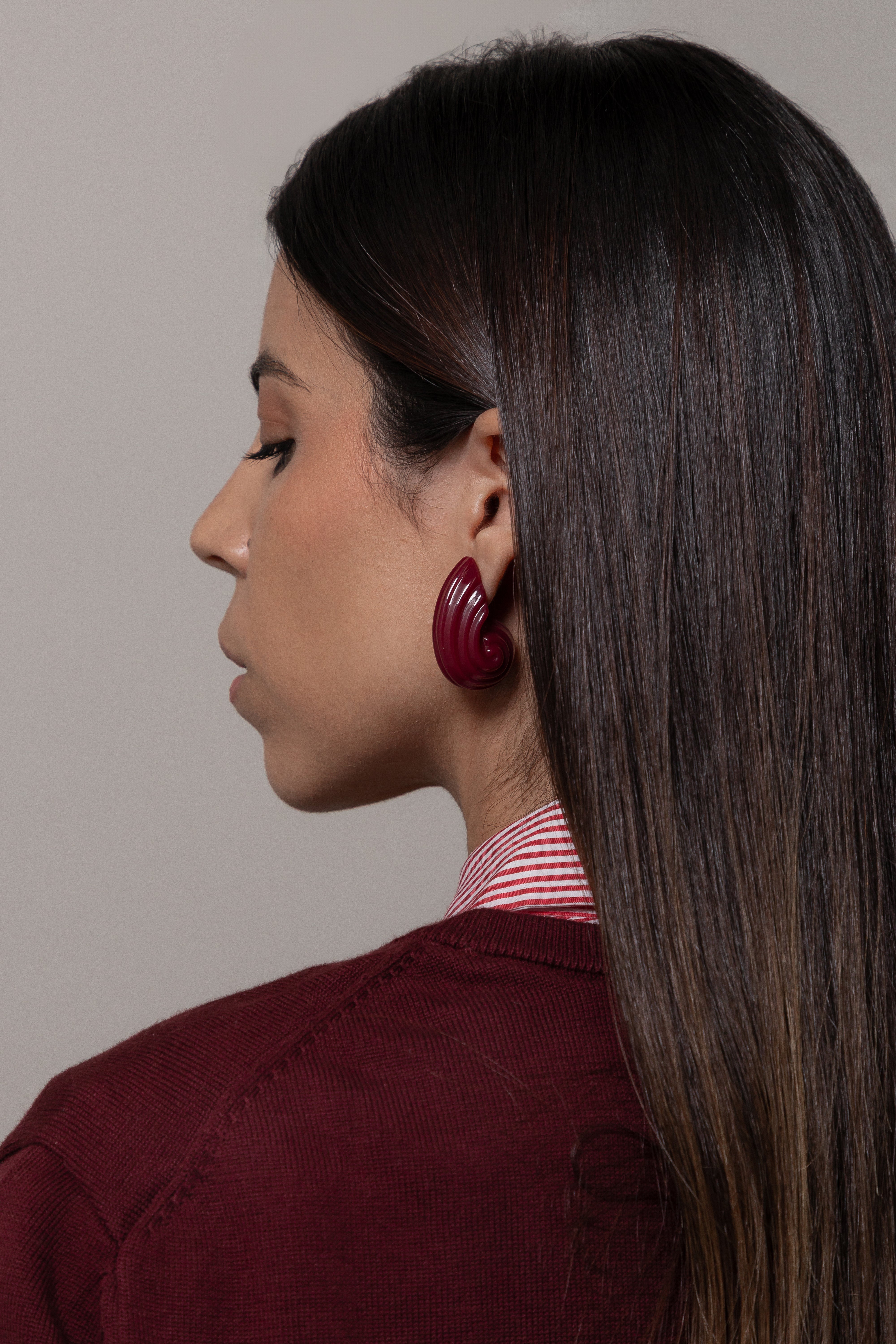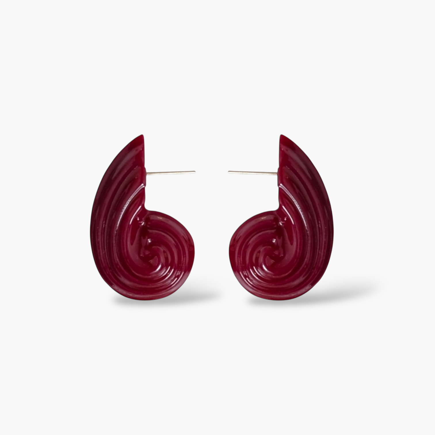 A modern ode to movement and form. The Caracol Earrings are shaped in rich burgundy resin — a hue that captures depth and sensuality. Finished with 18k gold-plated brass posts, they blend artistic presence with effortless wearability.