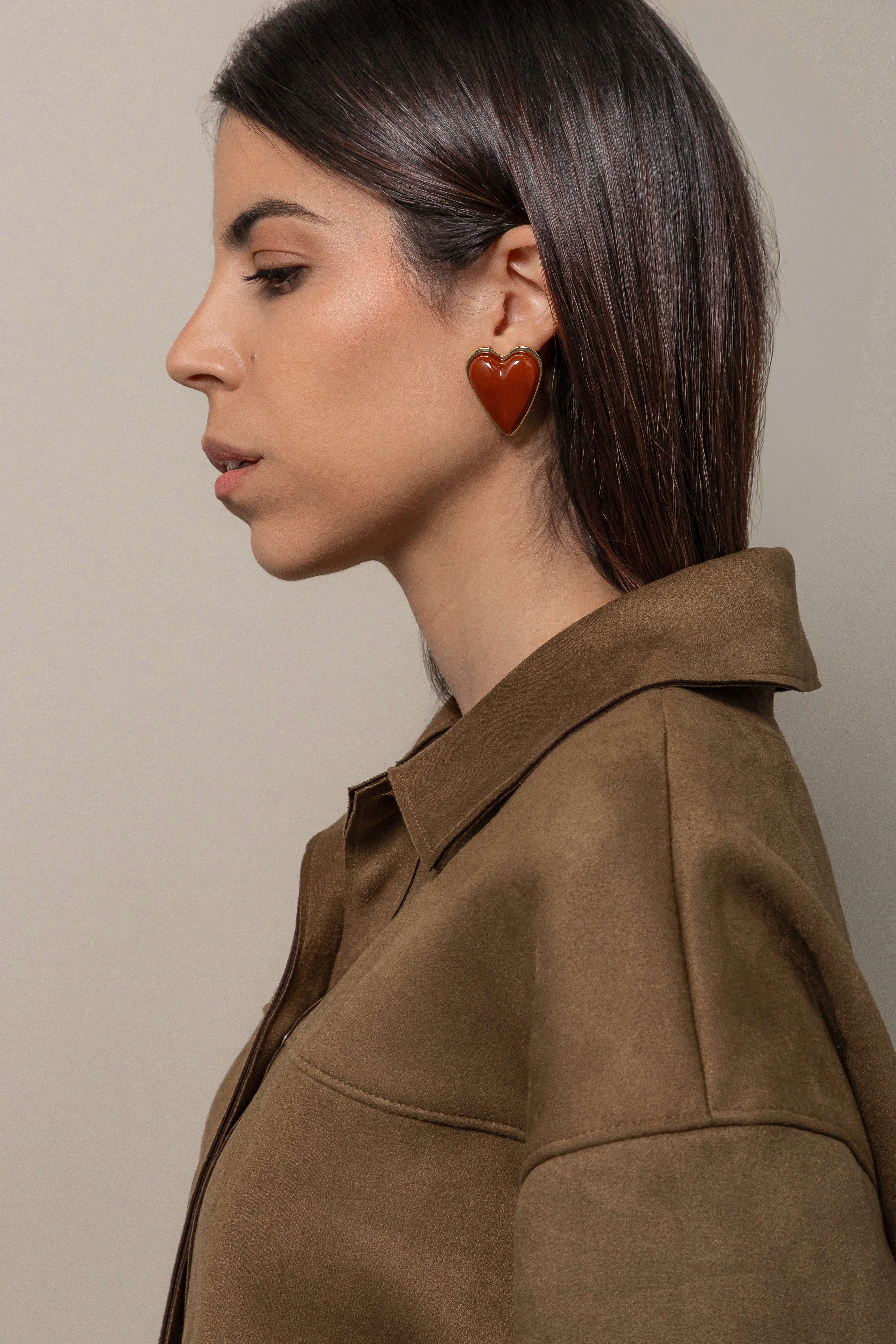 With their rich brown hue and glossy resin finish, these heart-shaped studs add a modern romantic touch to everyday looks. Framed in 18k gold plated brass, they exude vintage flair with a refined edge.