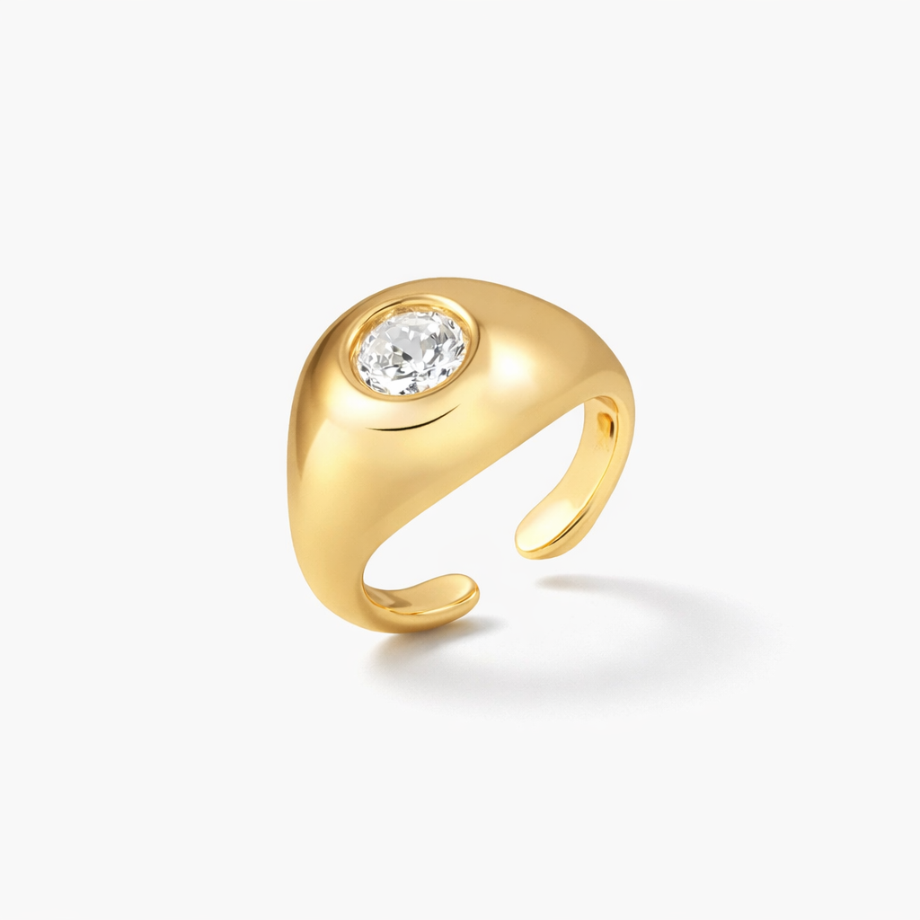 Delicate yet bold. CERCLE I is your modern-day pinky essential — sculpted with clean symmetry and crowned with a luminous cubic zirconia. Its compact shape, paired with 18k gold plating, adds understated shine to the smallest finger. A subtle nod to heritage, reimagined with minimalist edge.